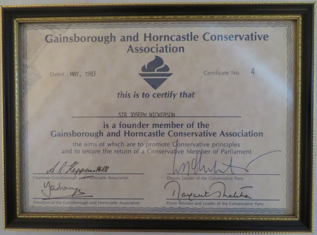Certificate for JN being a founding member of the Gainsborough and Horncastle Concervative Association