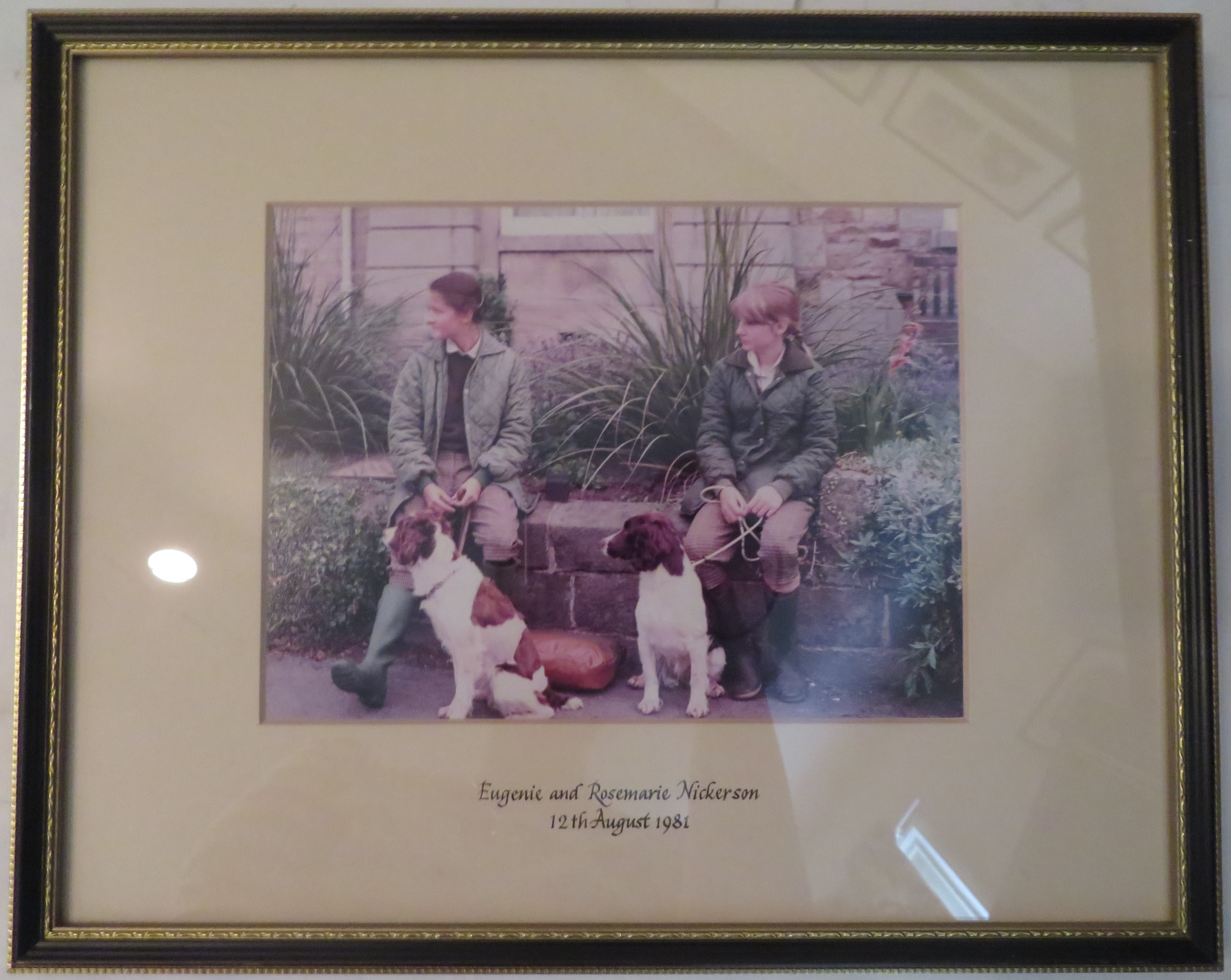 Jennie and Rosemarie Nickerson sitting on a wall with 2 spaniels 1981.