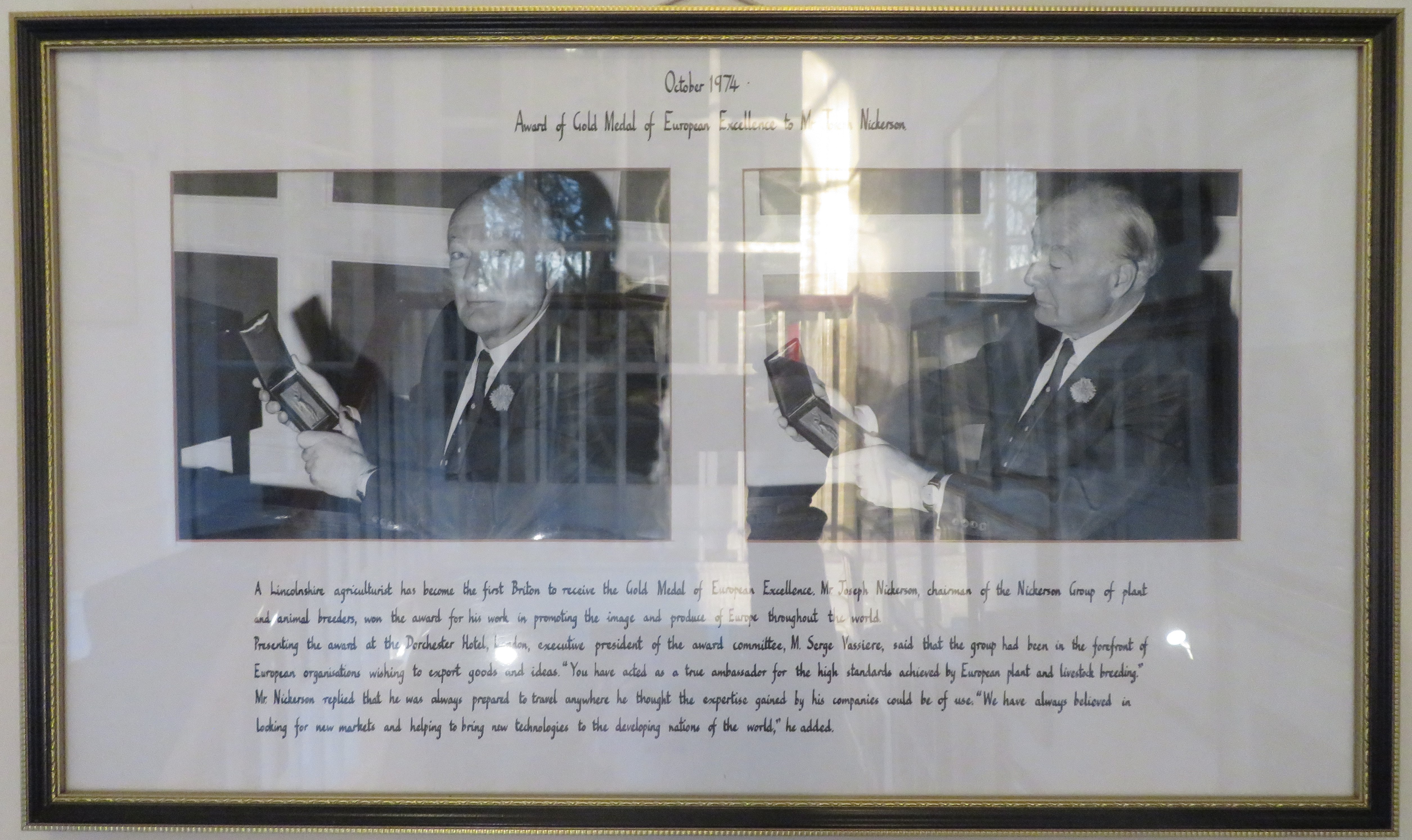 Two photos of Joseph Nickerson with his Gold Medal Award of European Excellence, 1974. JN was the first Briton to recive this award.