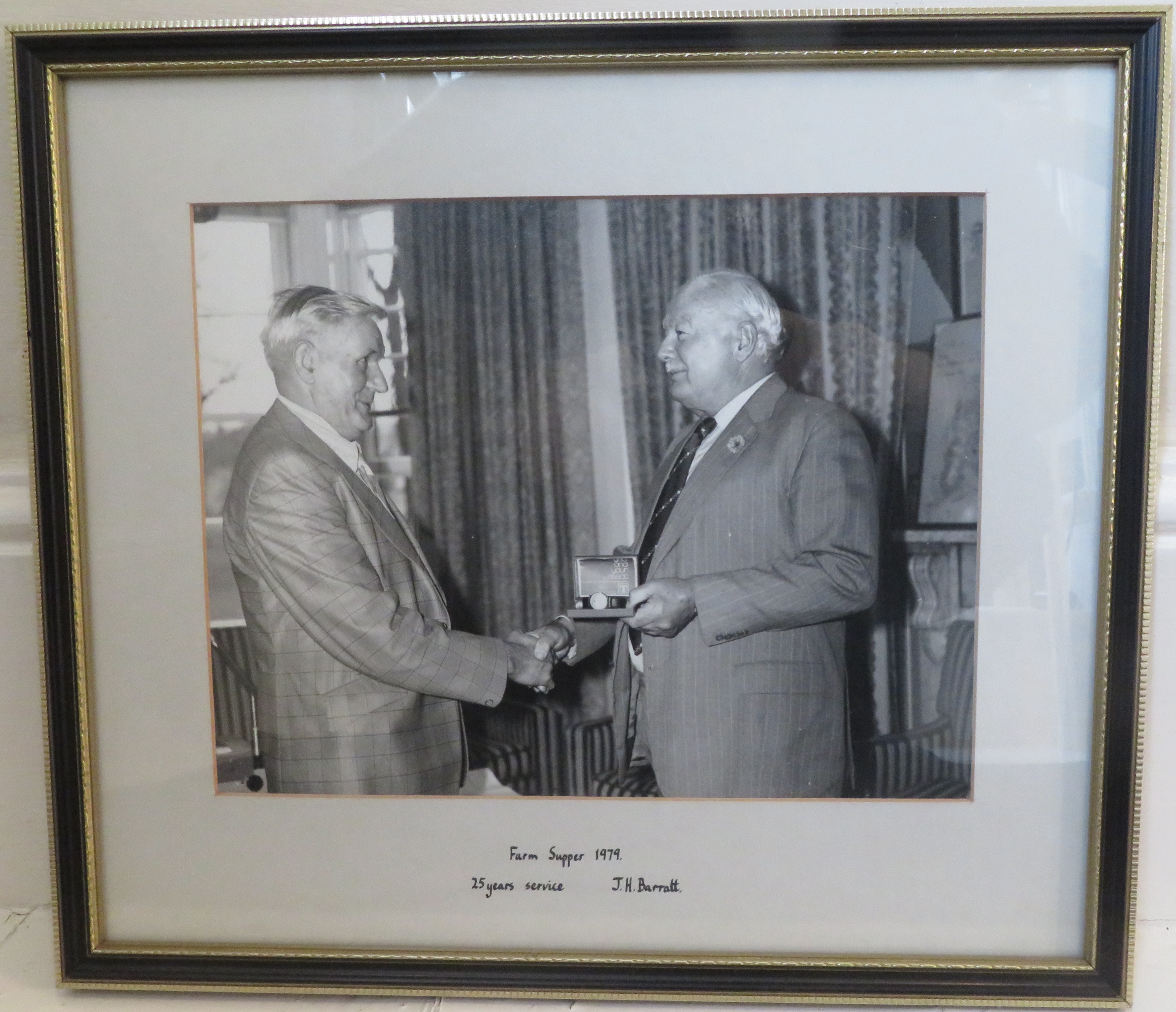J. Barratt reciving his award for 25 years service at the Farm Supper, 1979.