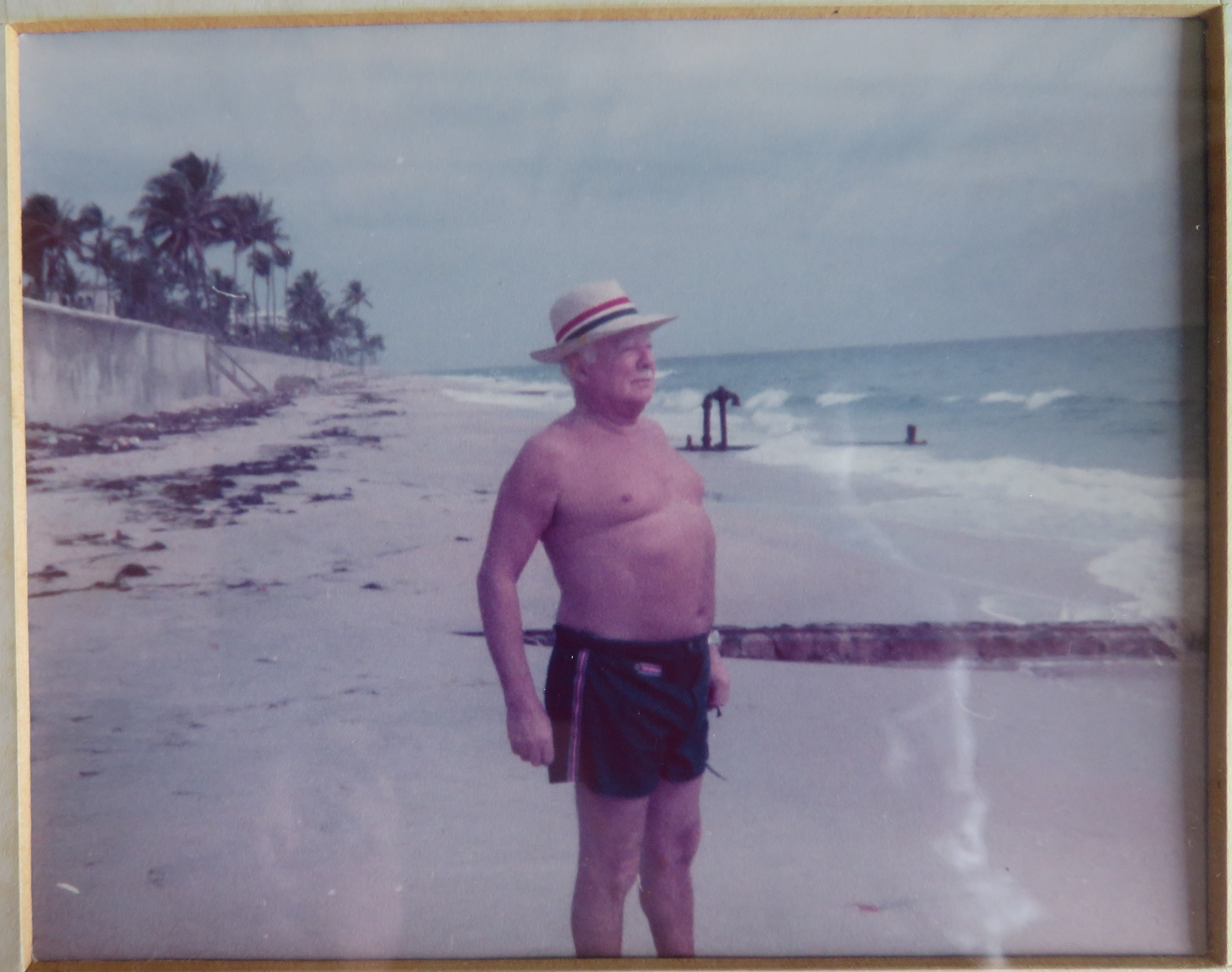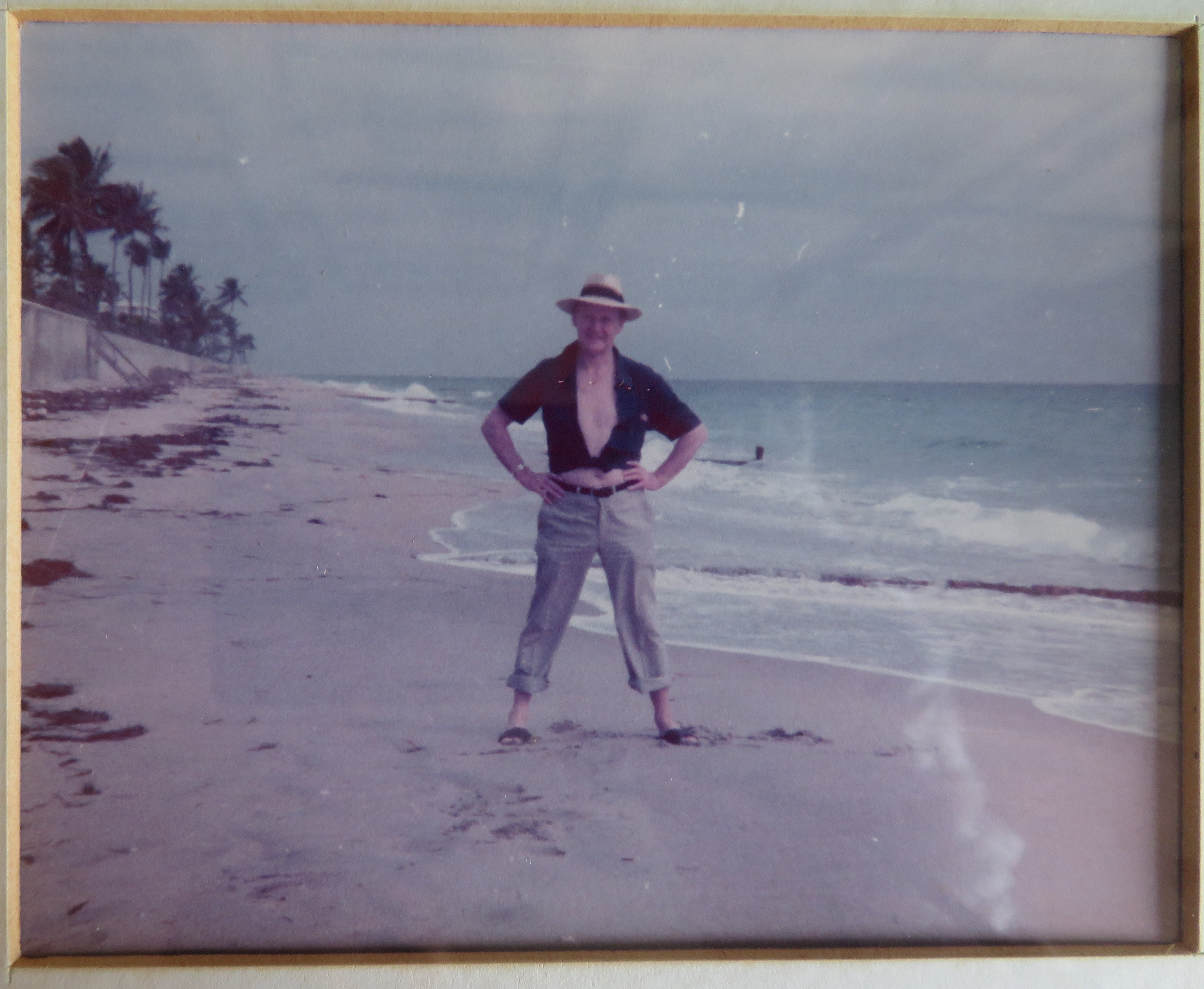 Two photos on Palm Beach 1979, one of a man with his hands on his hips and one of JN looking out to sea.
