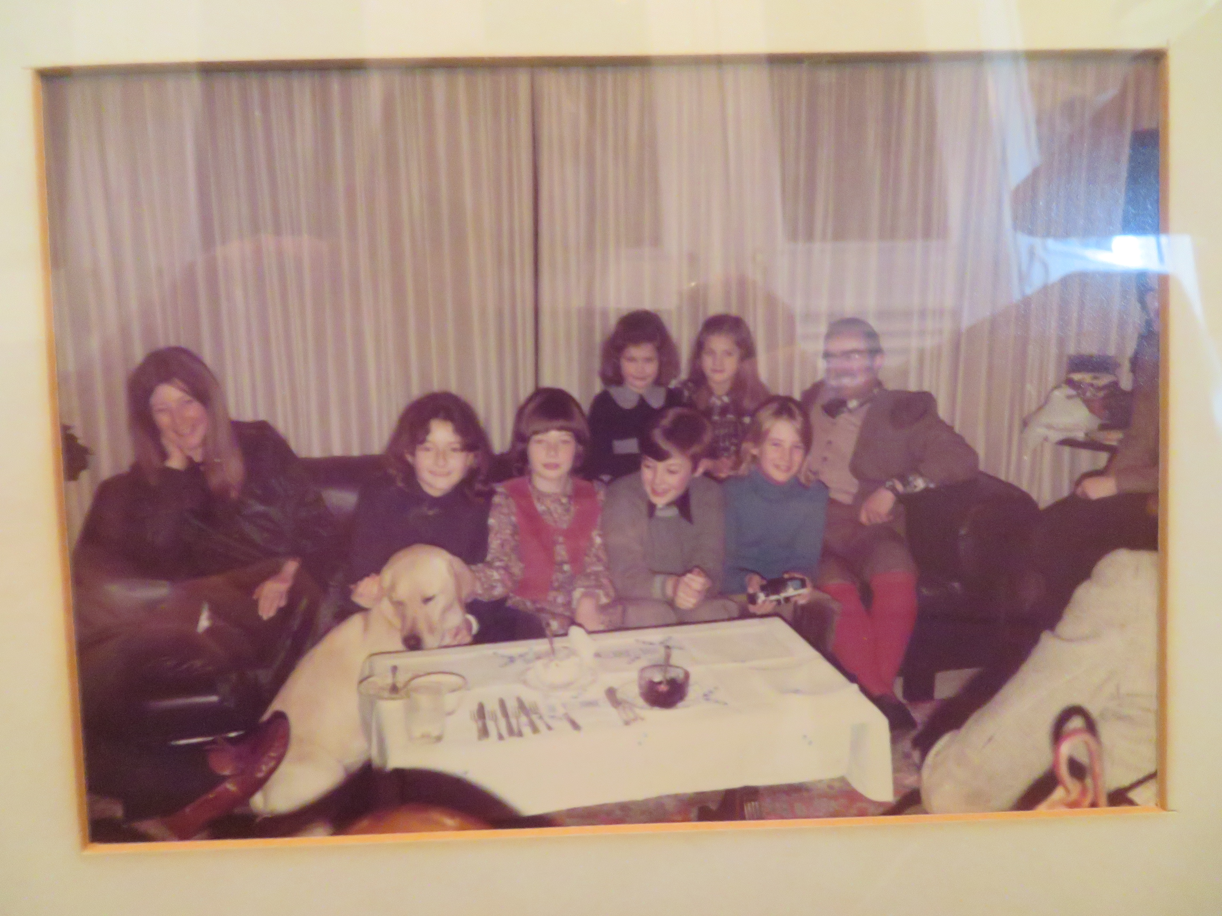 2 photos of a group of Nickerson family members and a yellow labrador gathered behind a table. 1 photo of Prince Charles jumping on a trampoline. 5 photos of Prince Charles, Jenny and Rosemarie Nickerson and a yellow labrador playing on a trampoline.