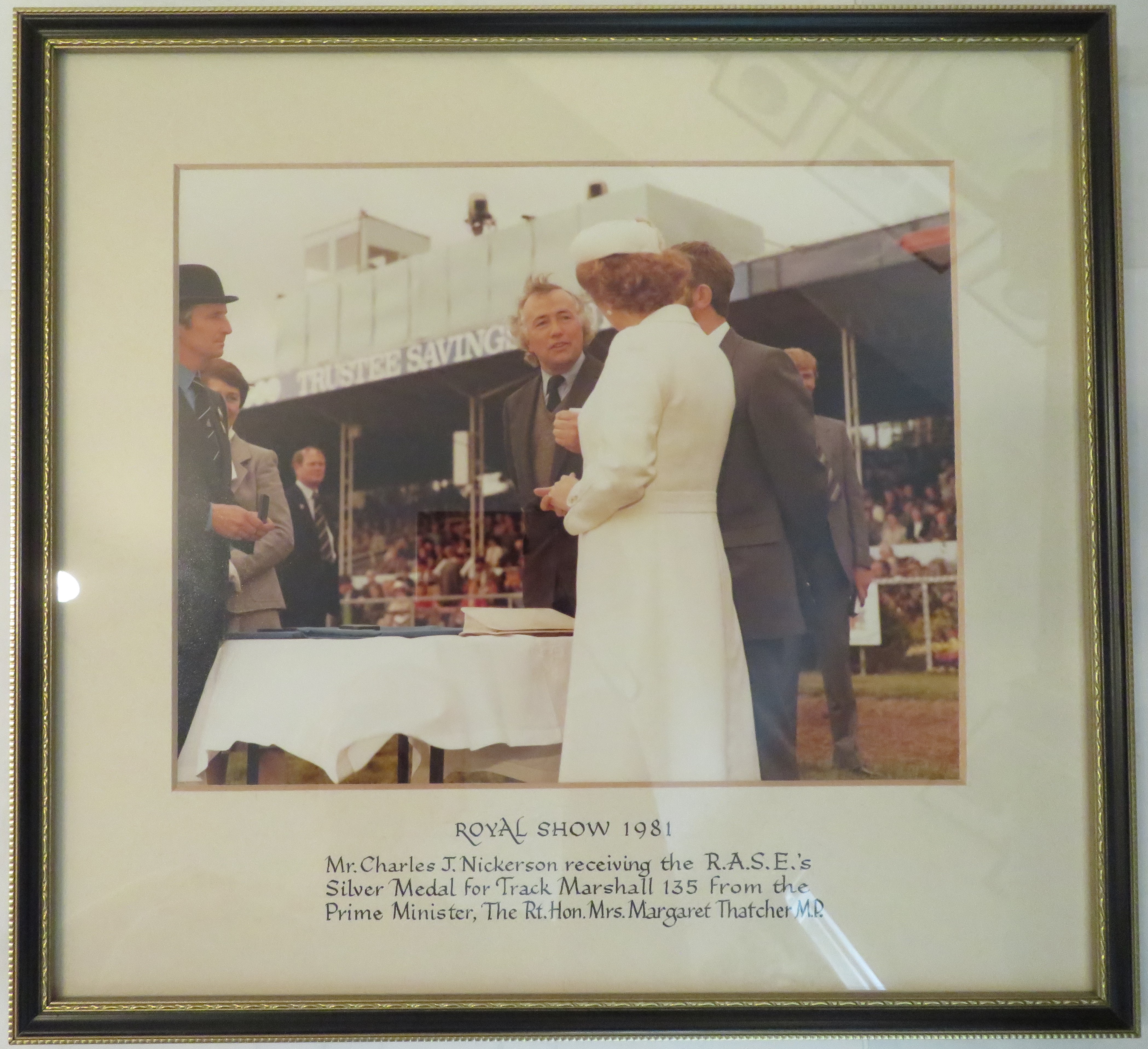 Charles Nickerson reciving the R.A.S.E.'s Silver Medal for Track Marshall 135 from the Prime Minister, Margaret Thatcher.