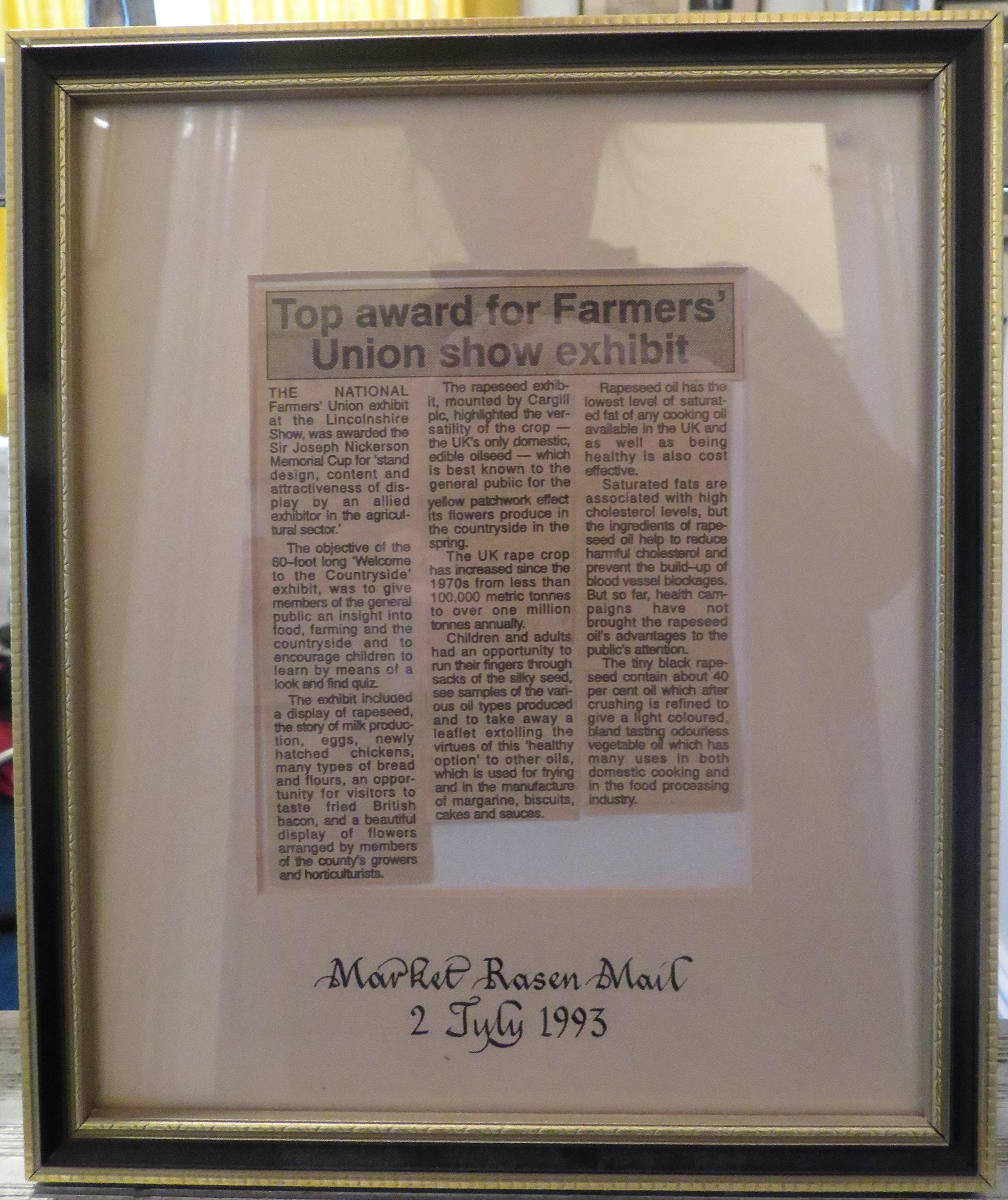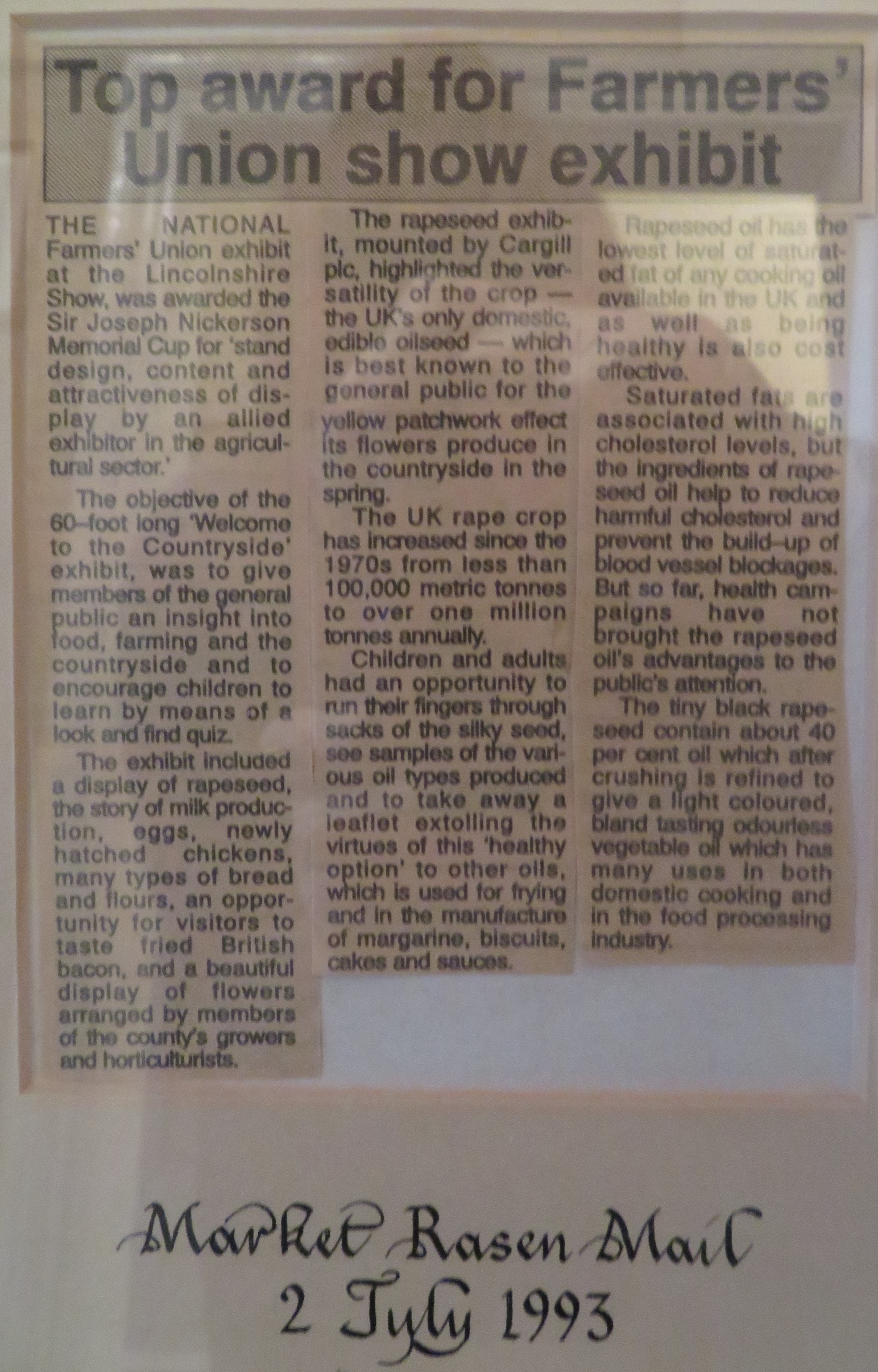 News clipping about the National Farmers Union exhibit at the Lincolnshire Show was awarded the Sir Joseph Nickerson Memorial Cup for stand design and content. 1993